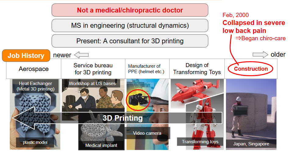I am not a medical doctor nor a chiropractic doctor. I learned structural dynamics in schools for technology. Currently, I run a consulting business specializing in 3D printing.